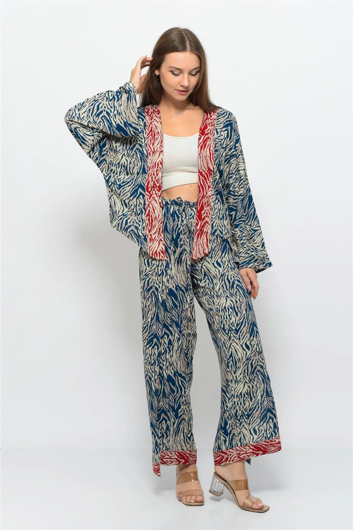 Nuseel Desenli Pareo Pantolon & Crop Kimono Mavi-Krem