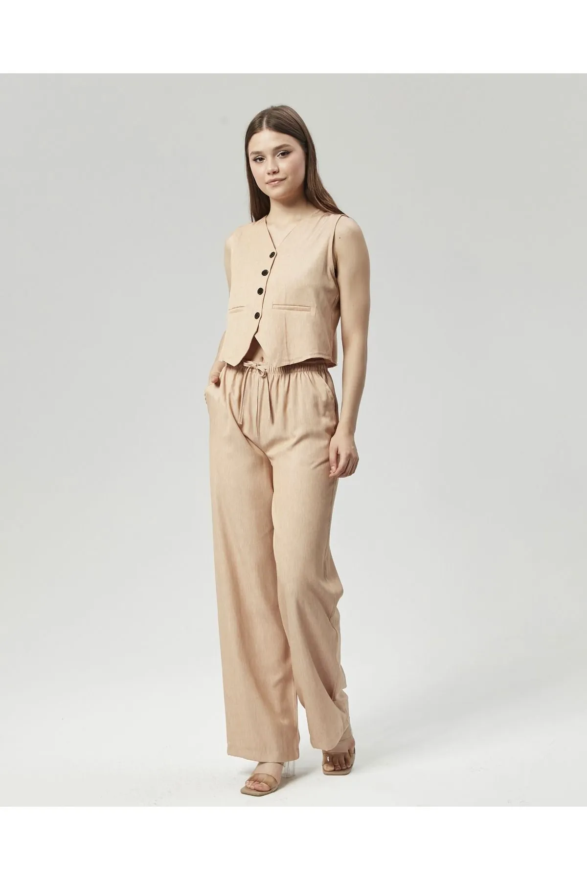 Nuseel Düz Kesim Atlantis Kumaş Pantolon & Yelek Takım Bej