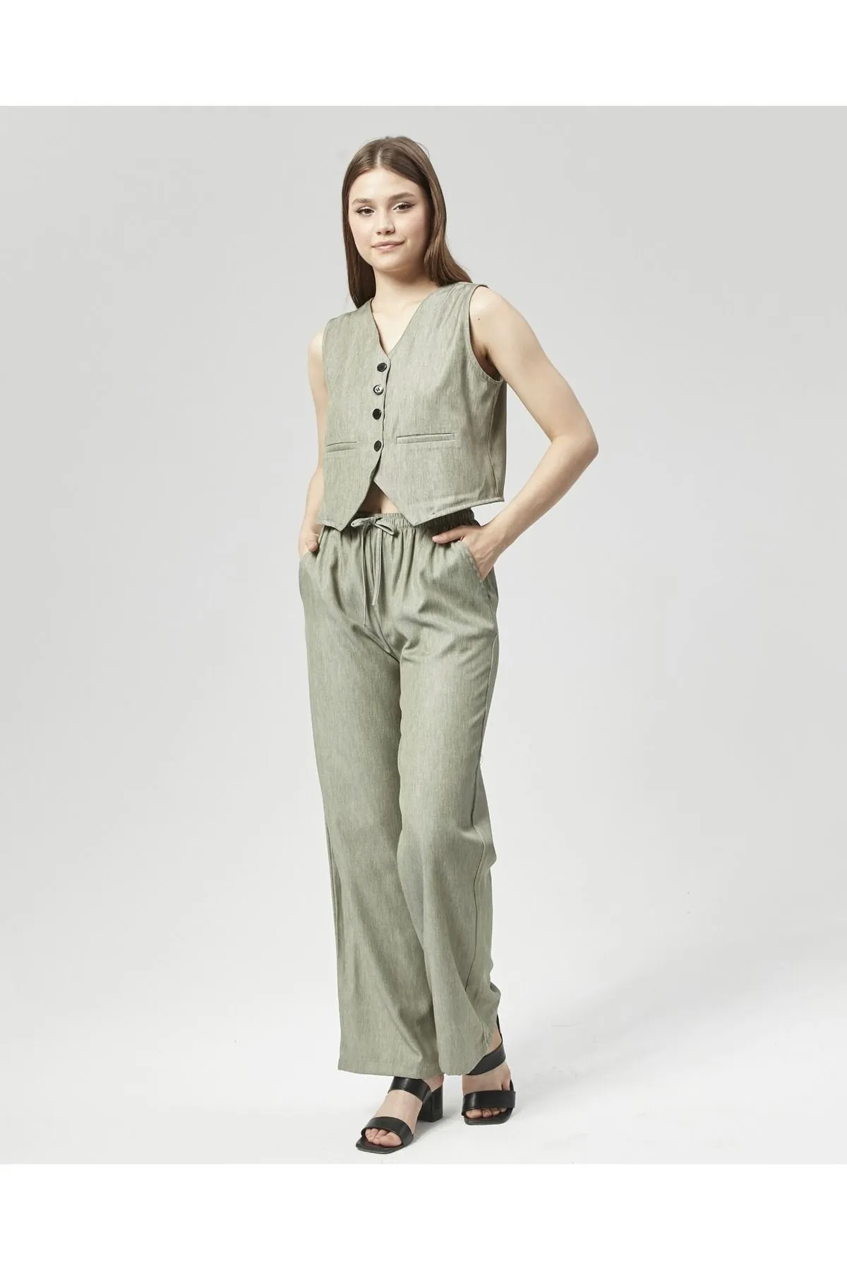 Nuseel Düz Kesim Atlantis Kumaş Pantolon & Yelek Takım Su Yeşili