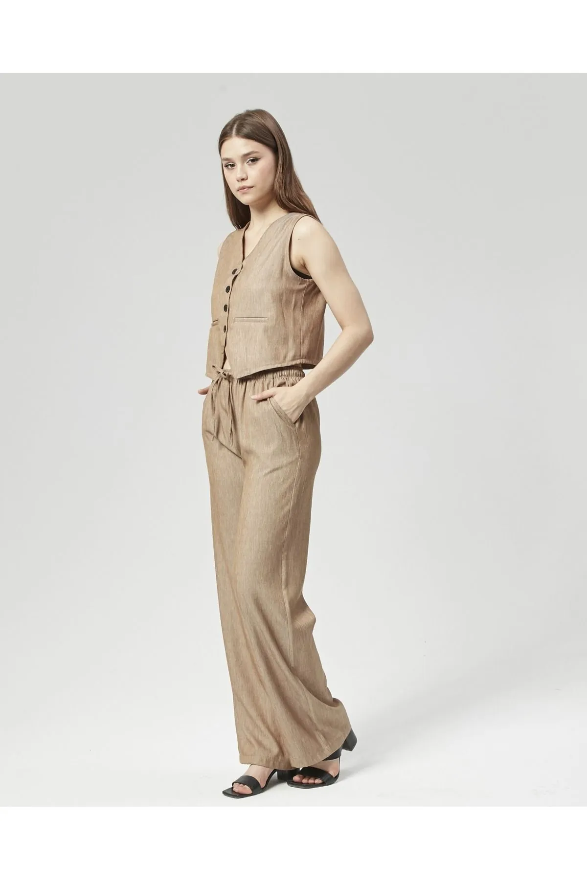 Nuseel Düz Kesim Atlantis Kumaş Pantolon & Yelek Takım Vizon