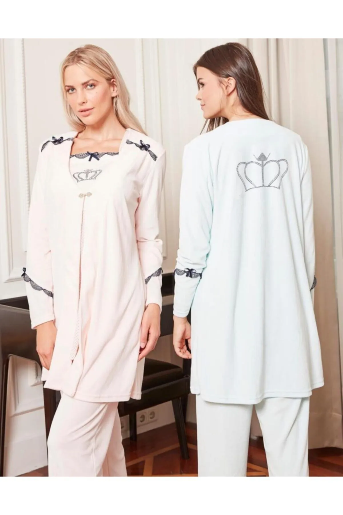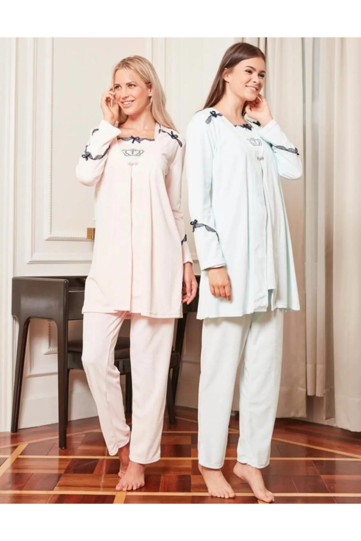 Bone Club Kadın 4806 Somon Kadife 3 Lü Hamile Lohusa Pijama Sabahlık