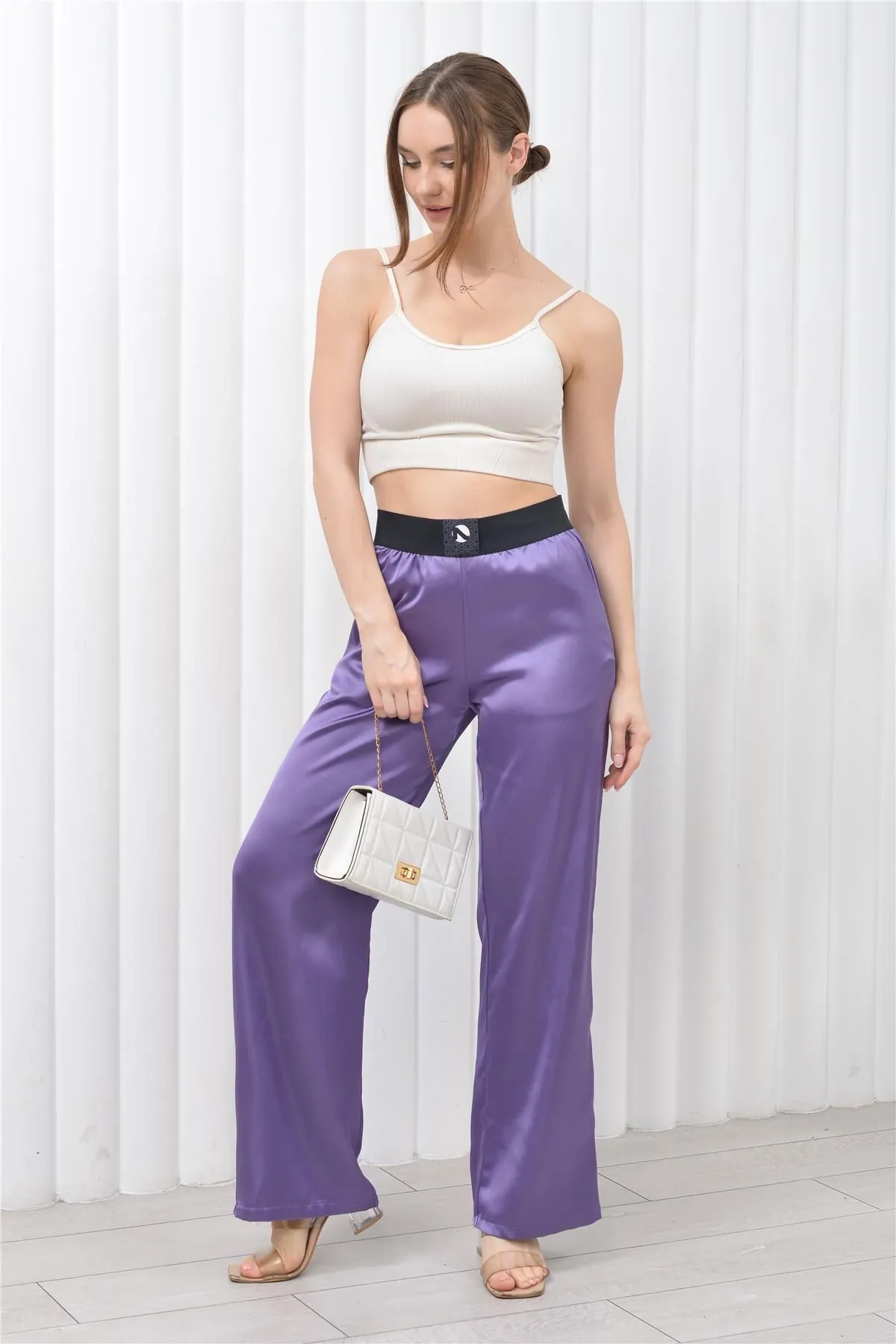 Nuseel Kadın Beli Lastikli Palazzo Saten Pantolon Lila