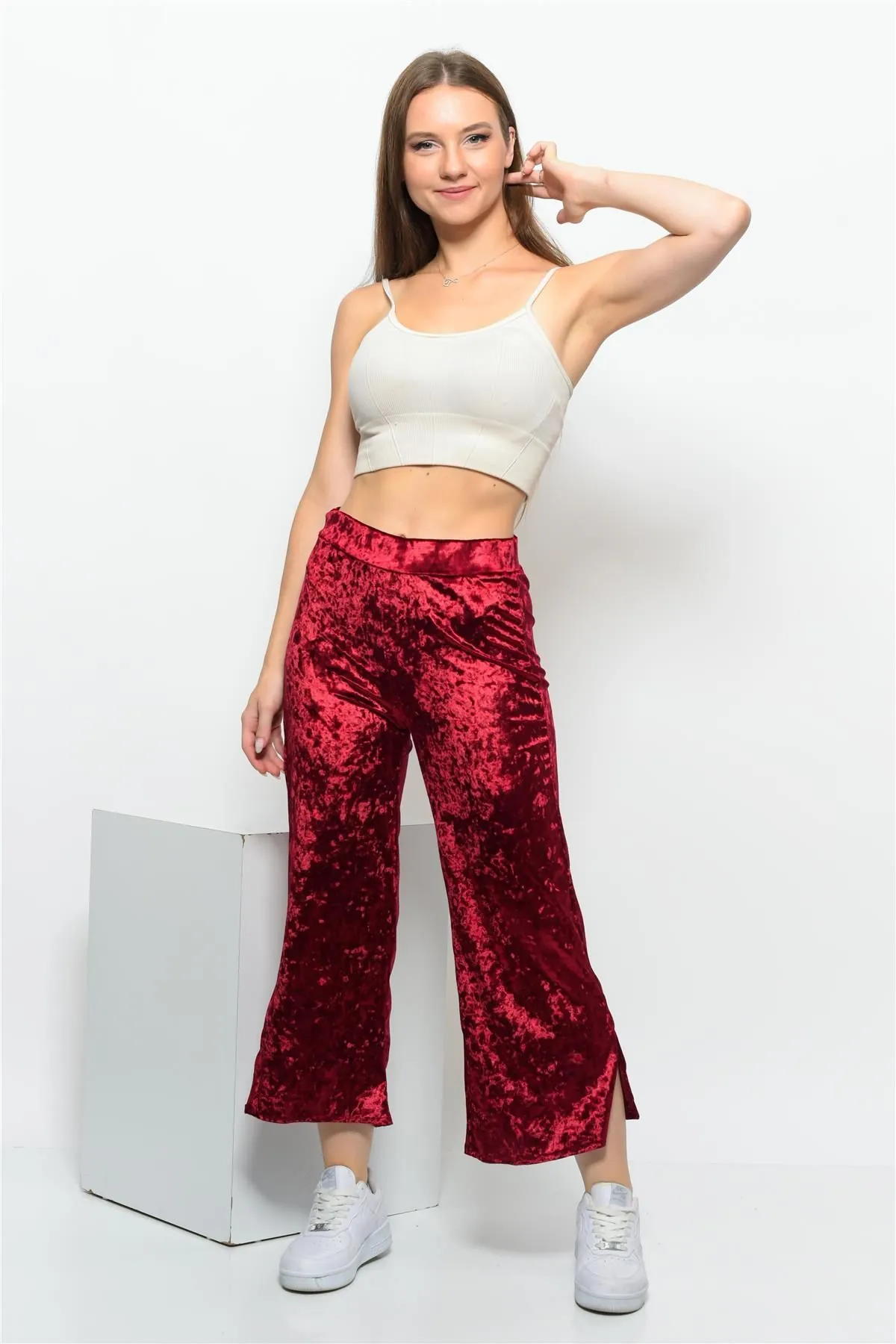 Nuseel Kadın Beli Lastikli Yandan Yırtmaçlı Janjanlı Kadife Pantolon Kırmızı