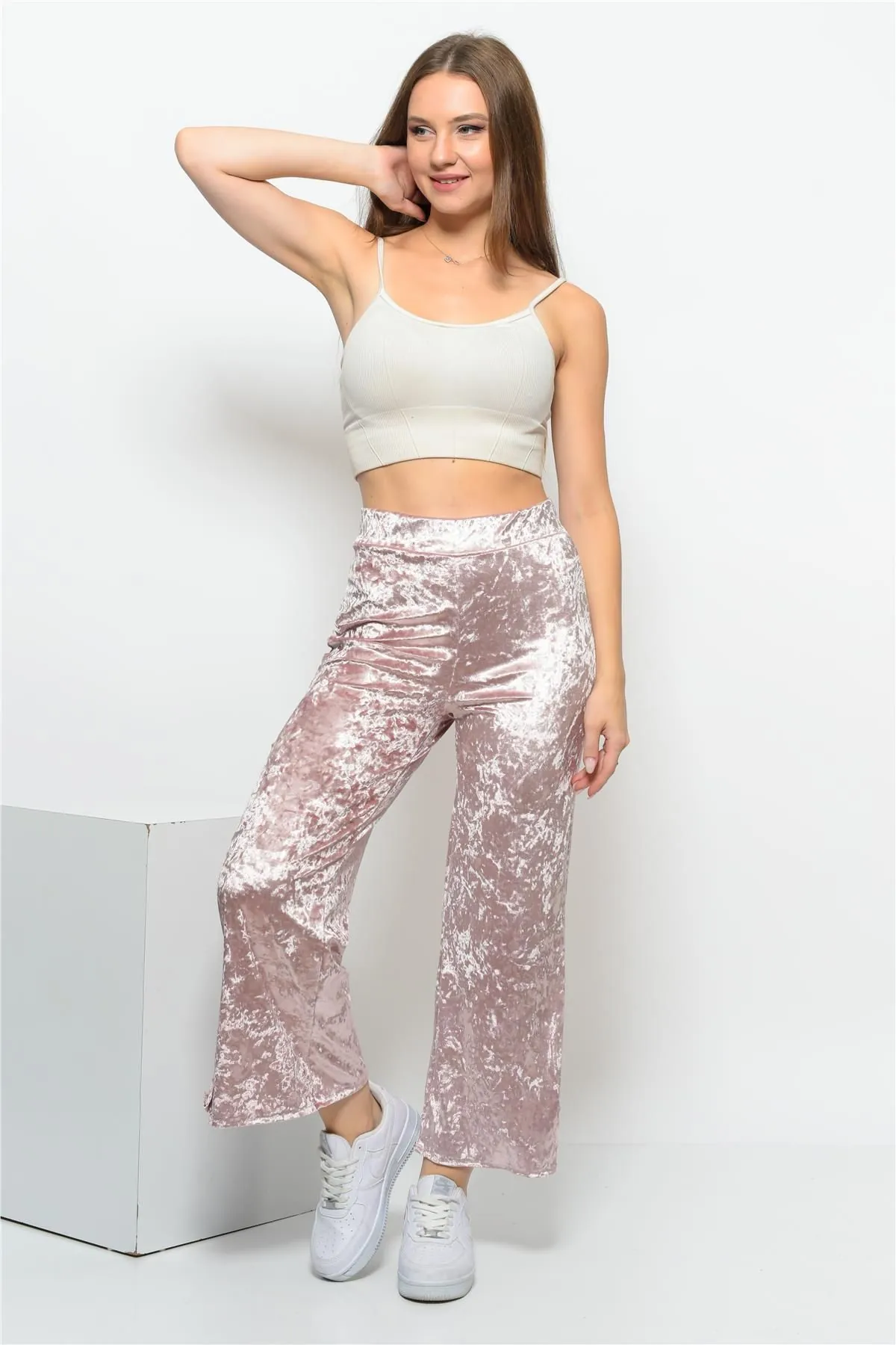 Nuseel Kadın Beli Lastikli Yandan Yırtmaçlı Janjanlı Kadife Pantolon Pudra