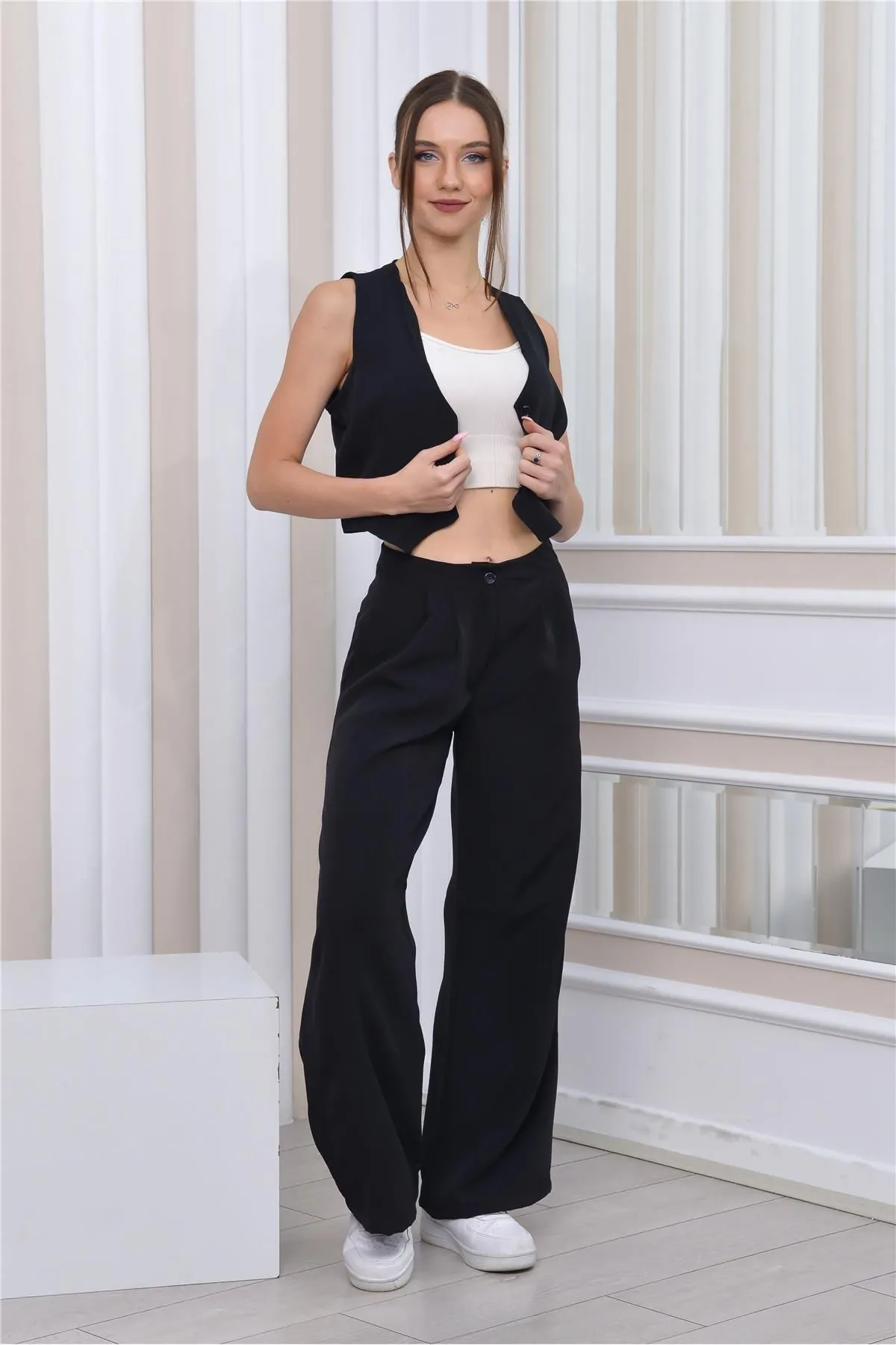 Nuseel Kadın Dabıl Kumaş Yelek-Pantolon İkili Takım Siyah