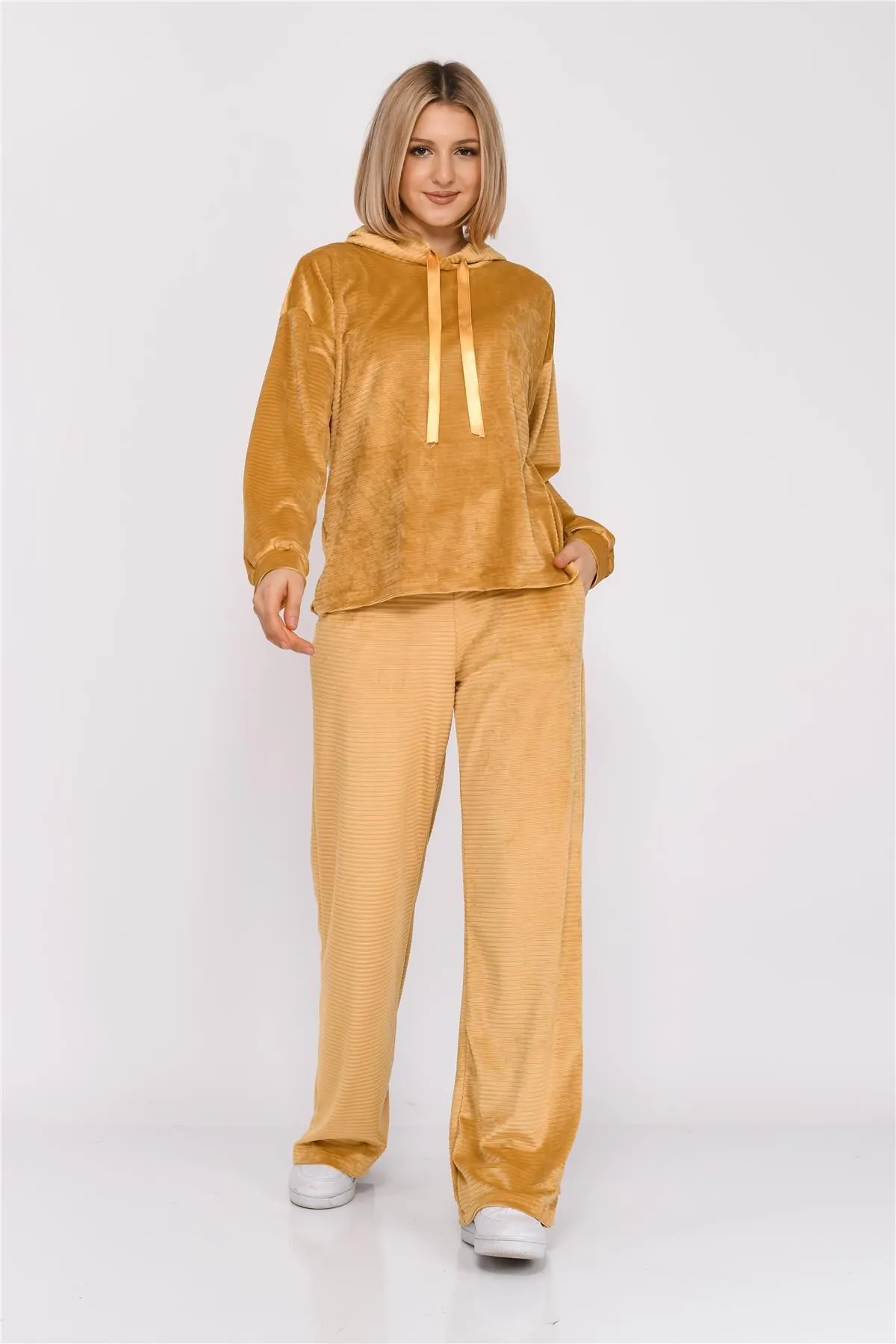 Nuseel Kadın Fitilli Kadife Kapşonlu Alt Üst Takım Hardal