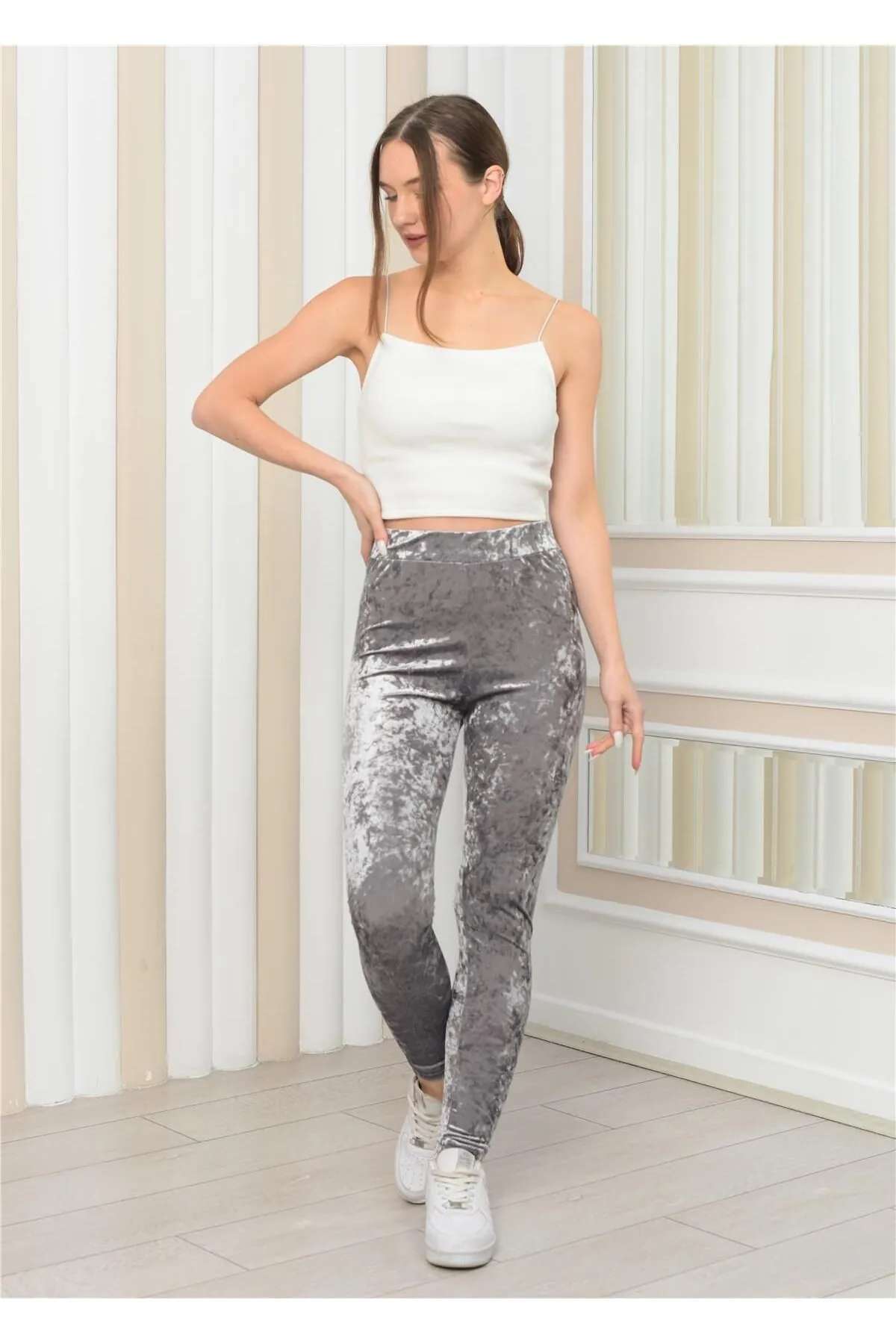 Nuseel Kadın Janjanlı Kadife Ligralı Tayt Antrasit