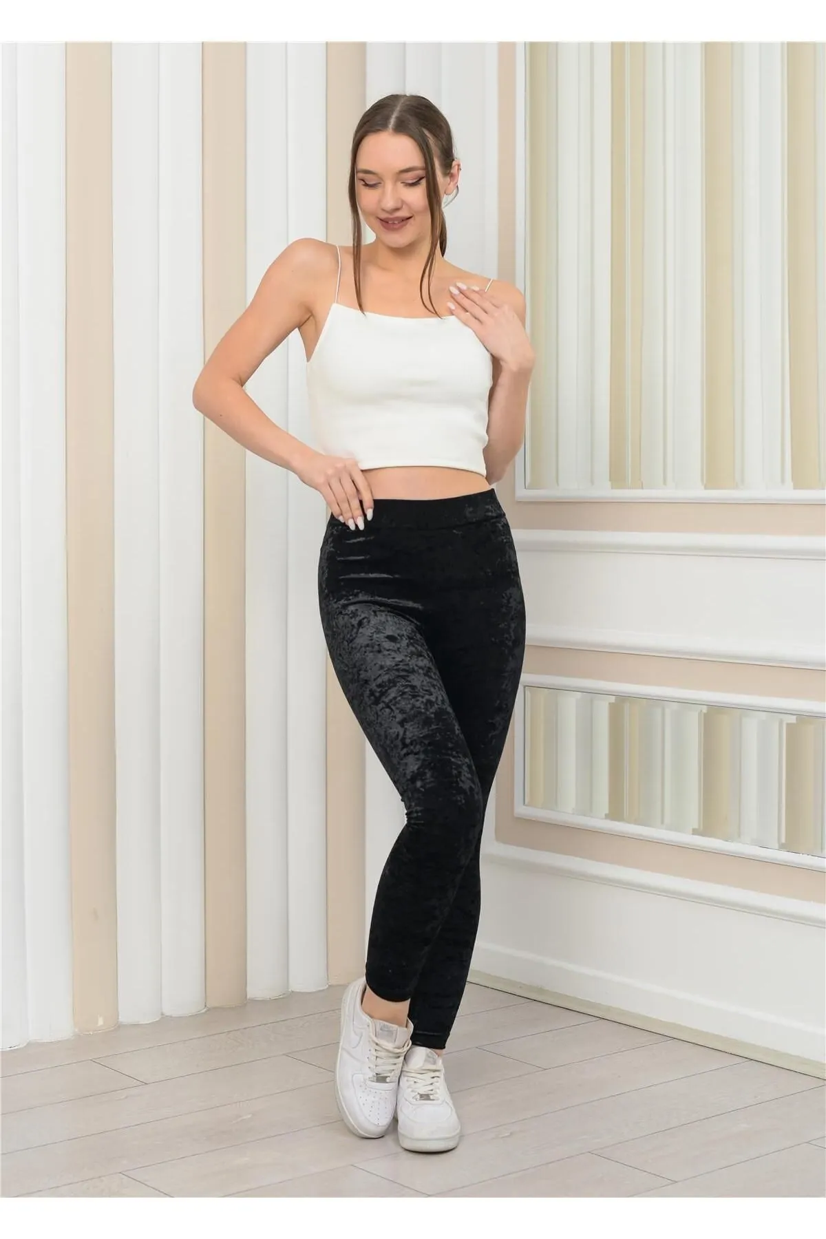 Nuseel Kadın Janjanlı Kadife Ligralı Tayt Siyah