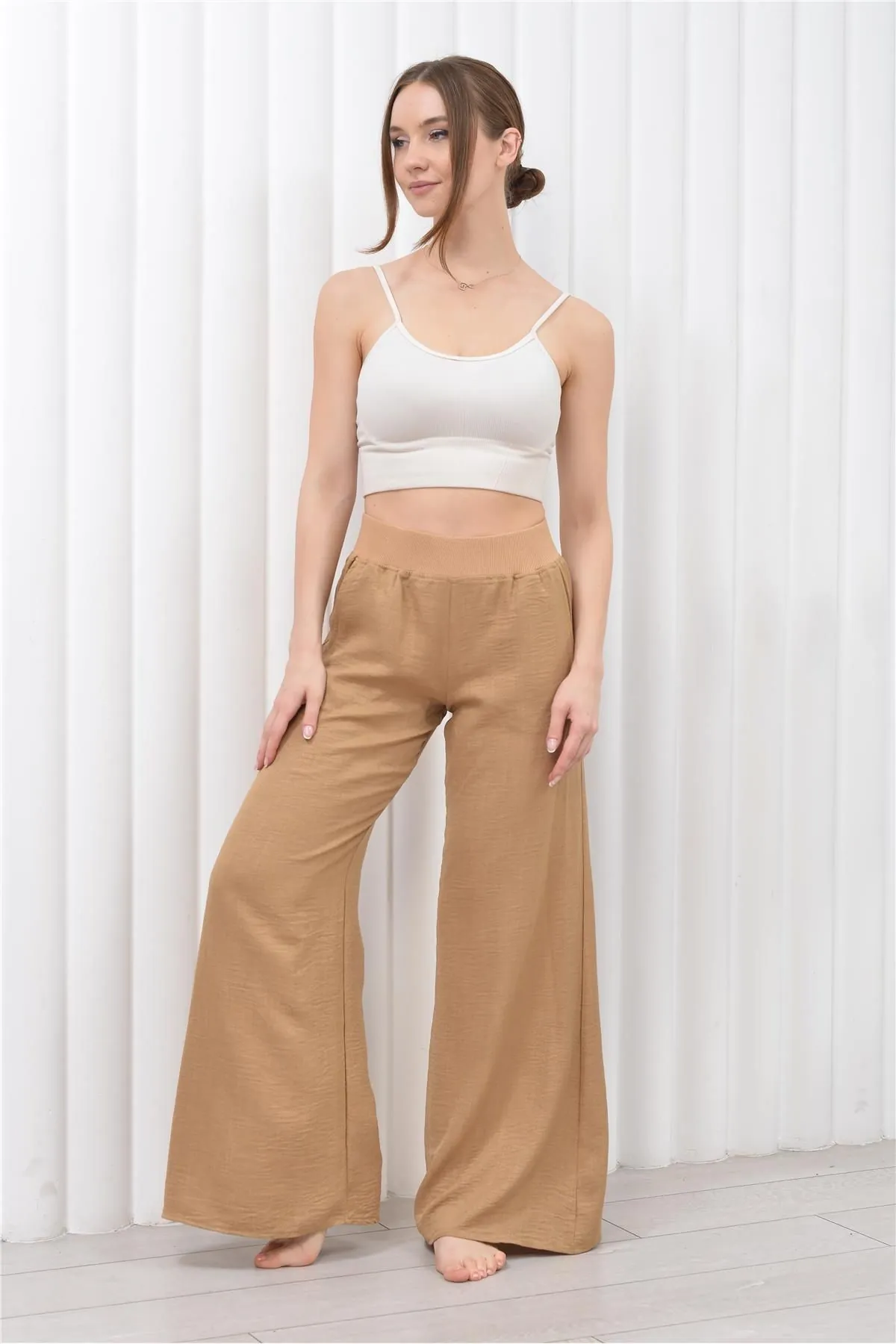 Nuseel Kadın Keten Beli Lastikli Cepli Pantolon Açık Kahve