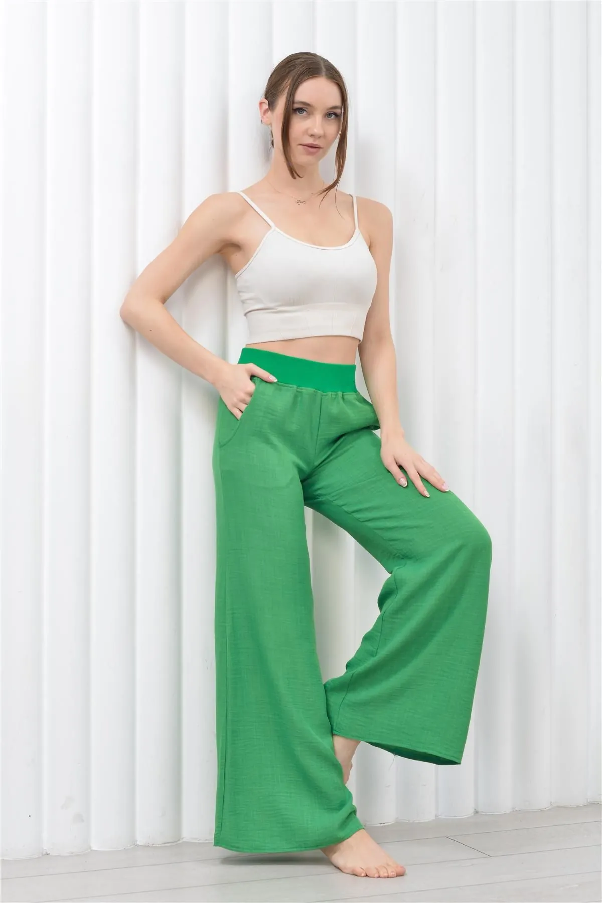 Nuseel Kadın Keten Beli Lastikli Cepli Pantolon Yeşil