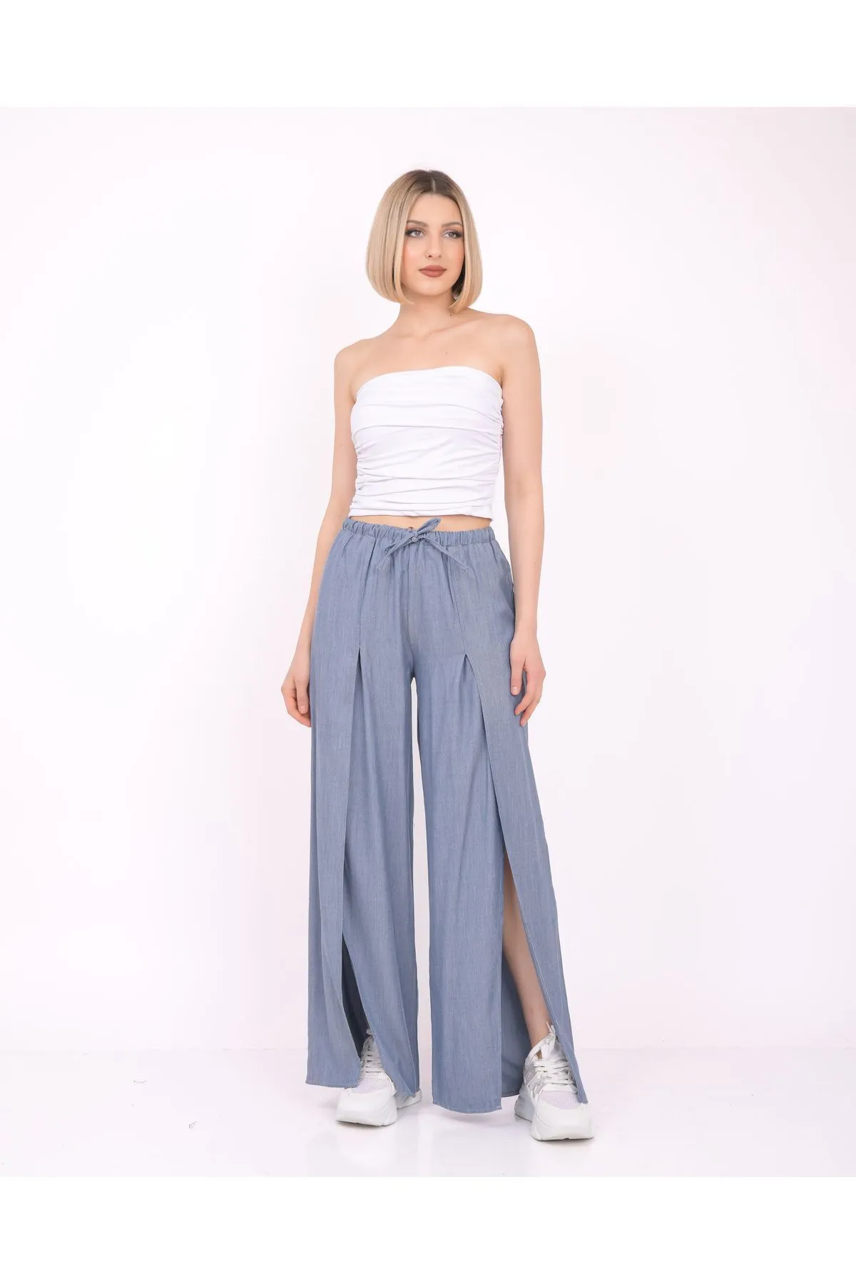 Nuseel Kadın Keten Kumaş Önden Yırtmaçlı Beli Lastikli Bol Kalıp Pantolon Açık Mavi