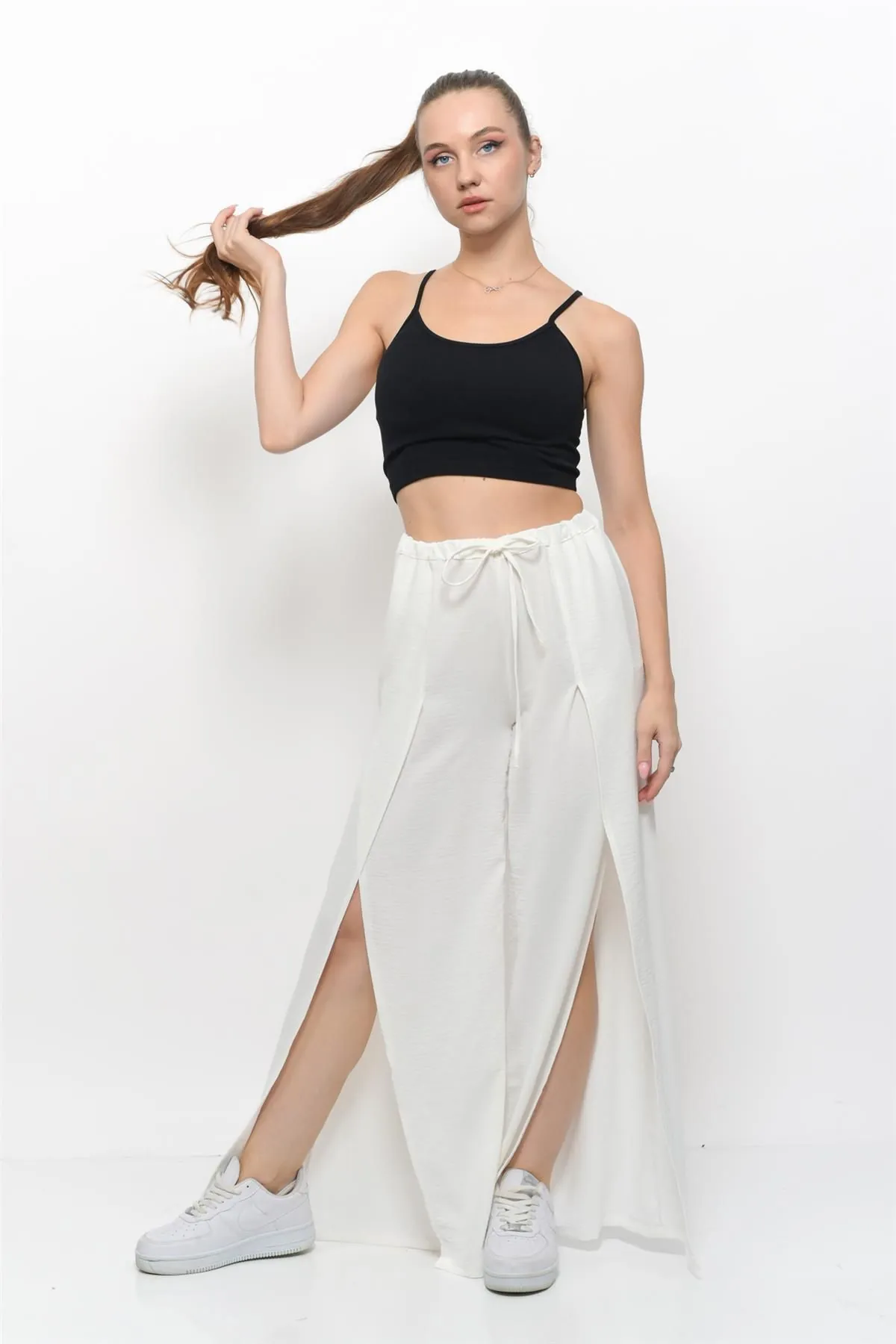 Nuseel Kadın Keten Kumaş Önden Yırtmaçlı Beli Lastikli Bol Kalıp Pantolon Beyaz