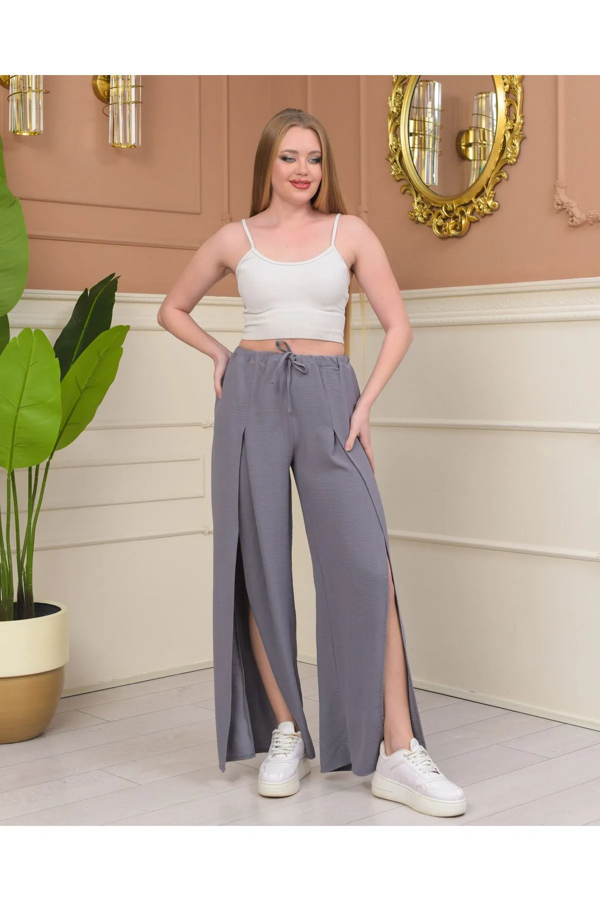 Nuseel Kadın Keten Kumaş Önden Yırtmaçlı Beli Lastikli Bol Kalıp Pantolon KoyuGri