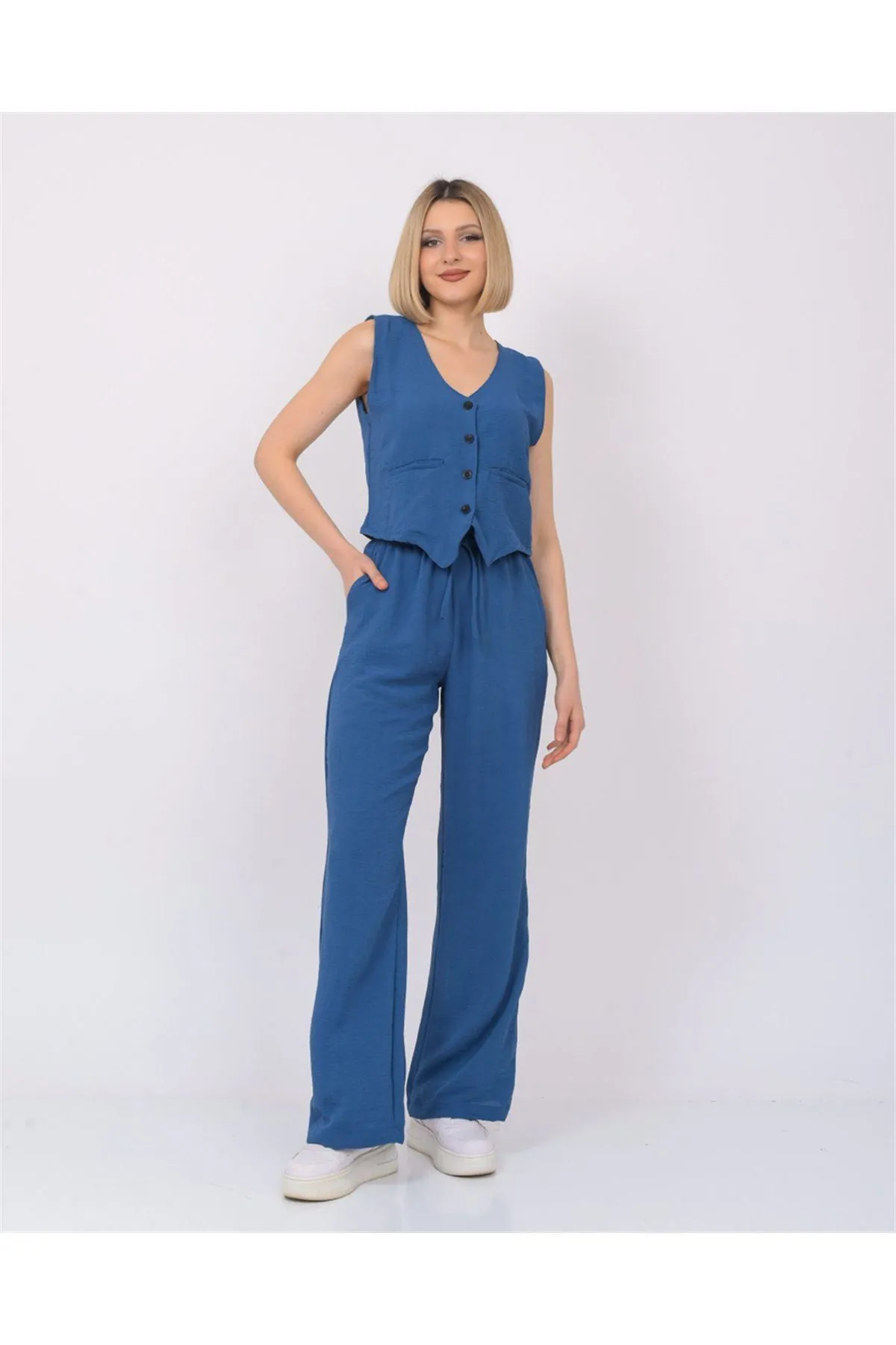 Nuseel Kadın Keten Kumaş Yelekli İkili Takım İndigo