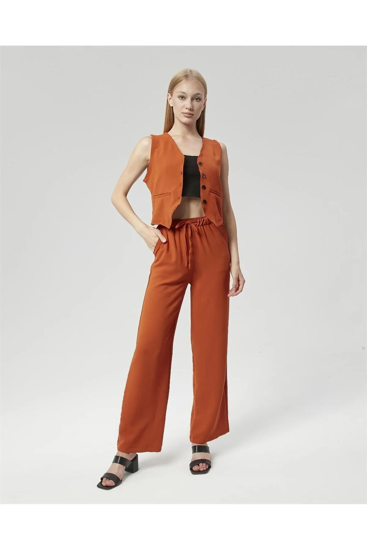 Nuseel Kadın Keten Kumaş Yelekli Ikili Takım Kiremit