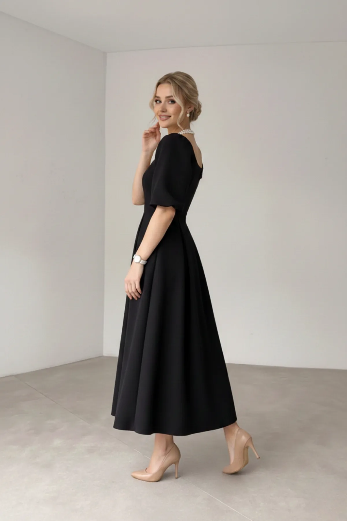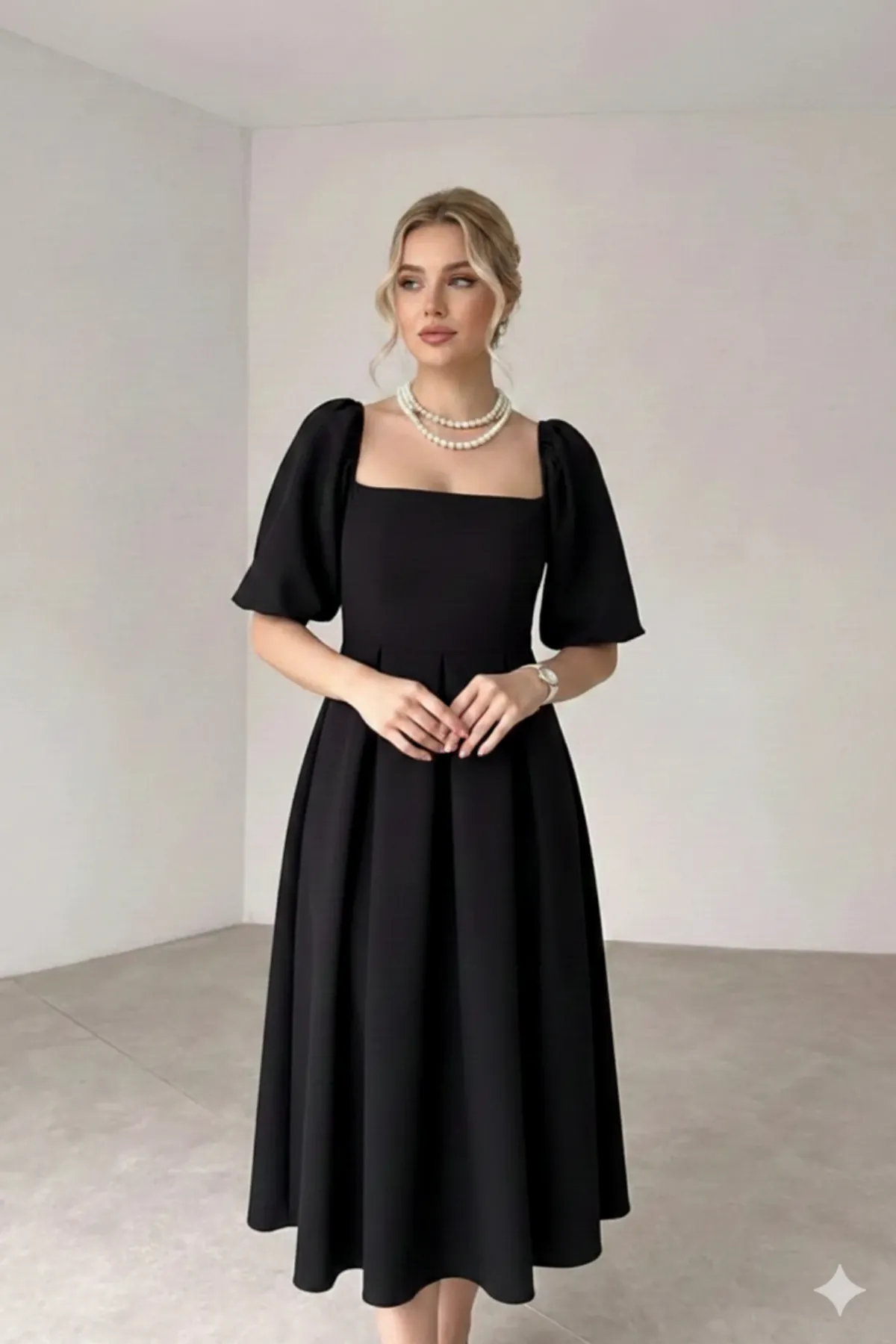 The KETHEN Kadın Krep Kumaş Balon Kol Pileli Kare Yaka Midi Boy Elbise