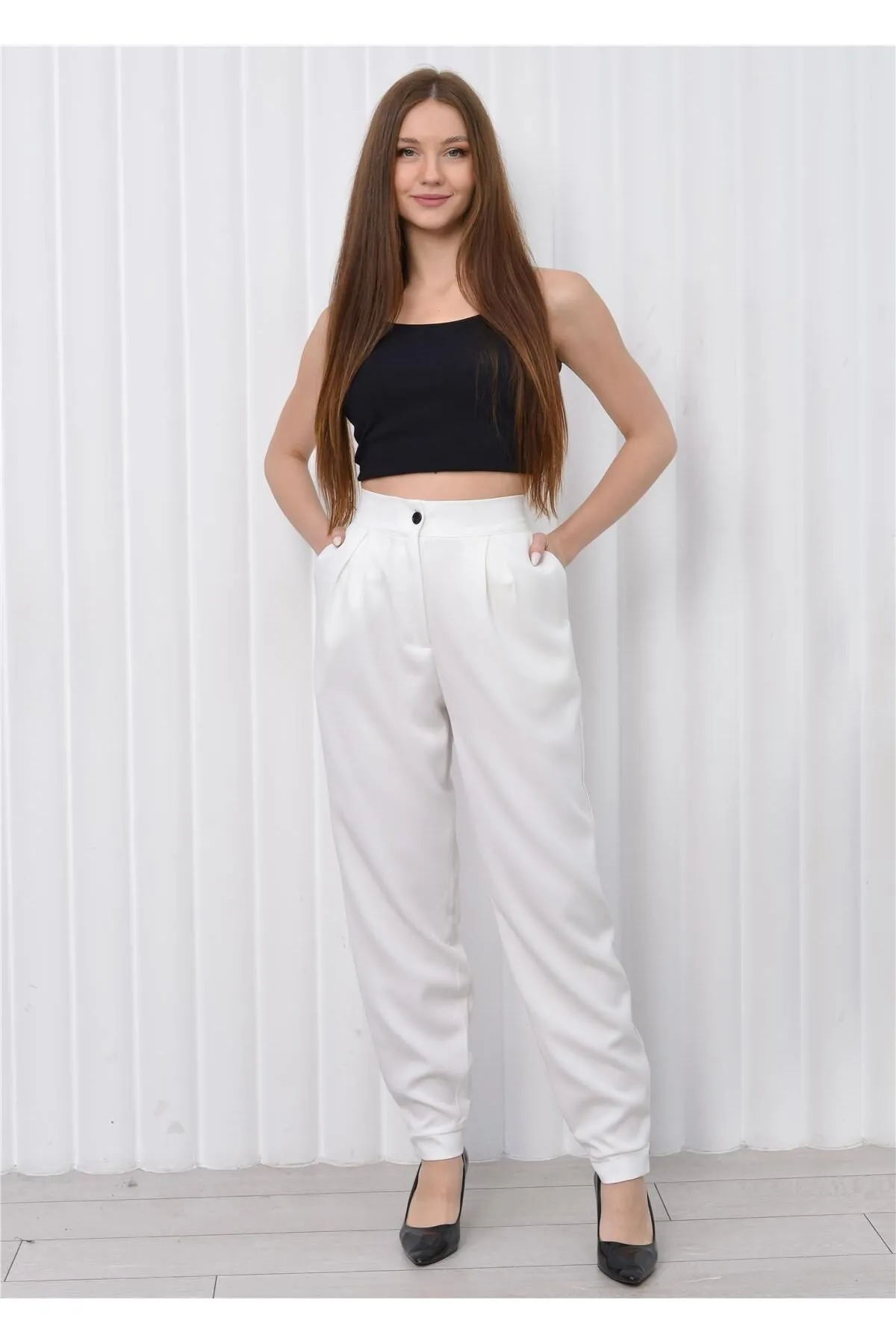 Nuseel Kadın Manşet Paça Yüksek Bel Pantolon Beyaz