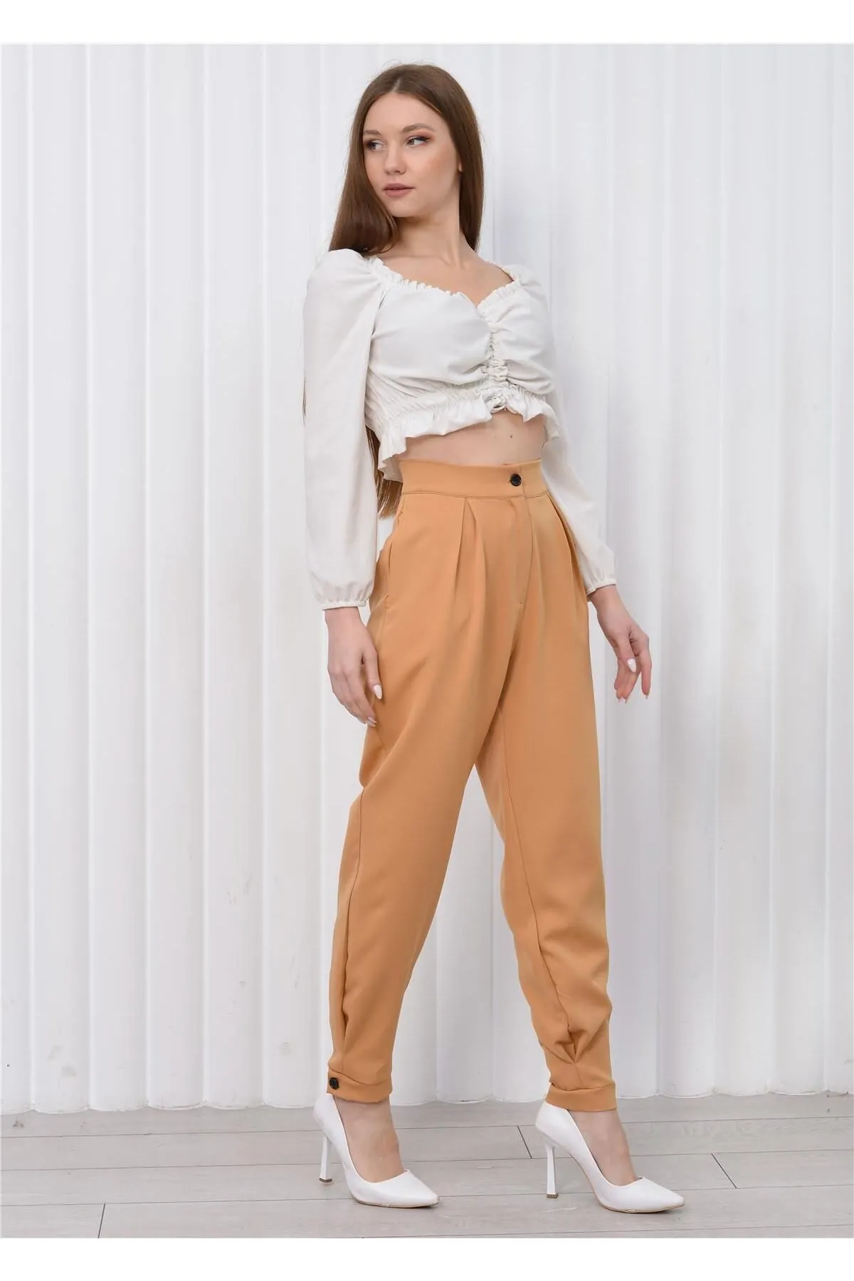 Nuseel Kadın Manşet Paça Yüksek Bel Pantolon Camel