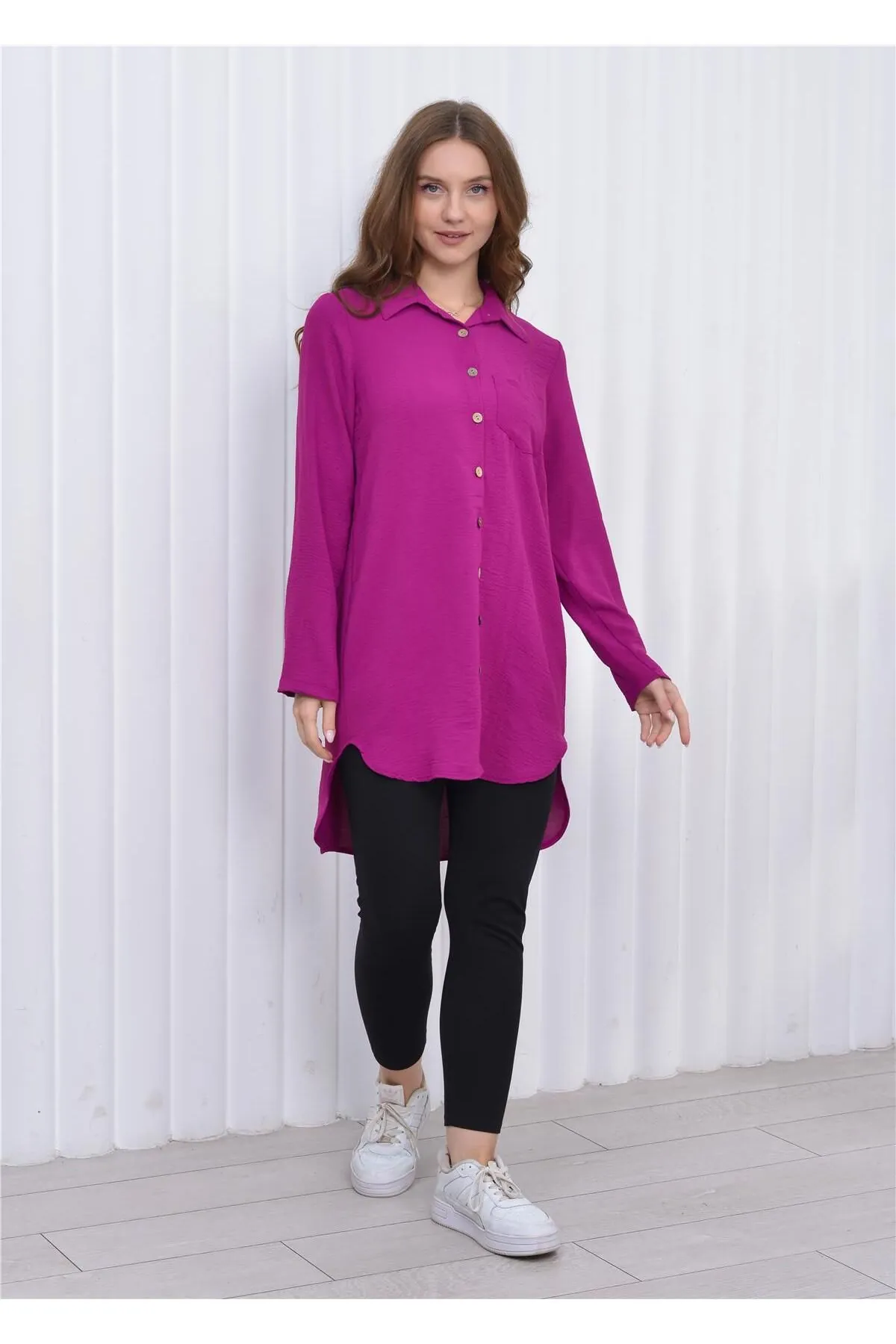 Nuseel Kadın Uzun Önden Düğmeli Aerobin Tunik Gömlek Gül Kurusu