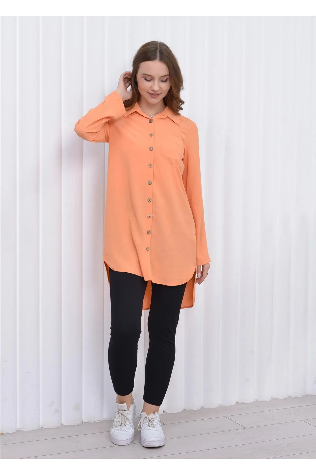 Nuseel Kadın Uzun Önden Düğmeli Aerobin Tunik Gömlek Orange