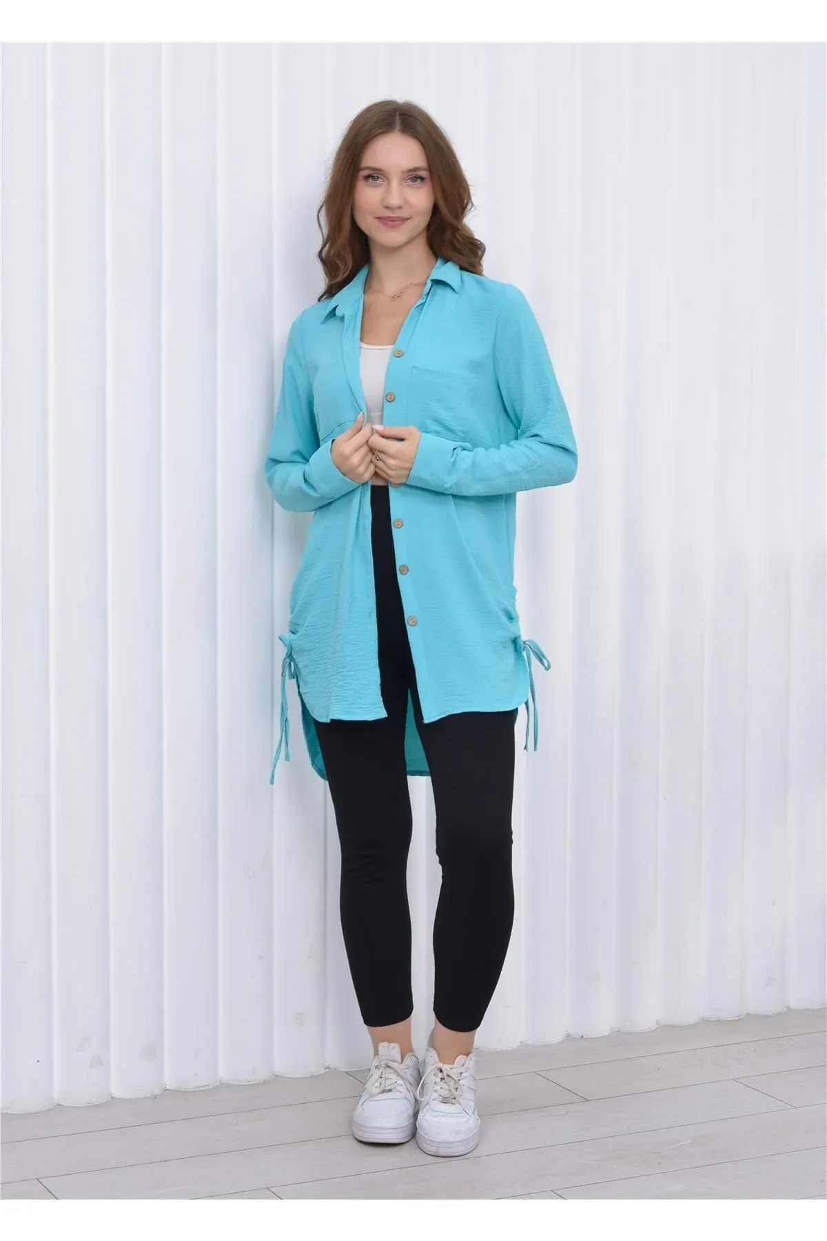 Nuseel Kadın Yandan İp Detaylı Aerobin Tunik Gömlek Turkuaz