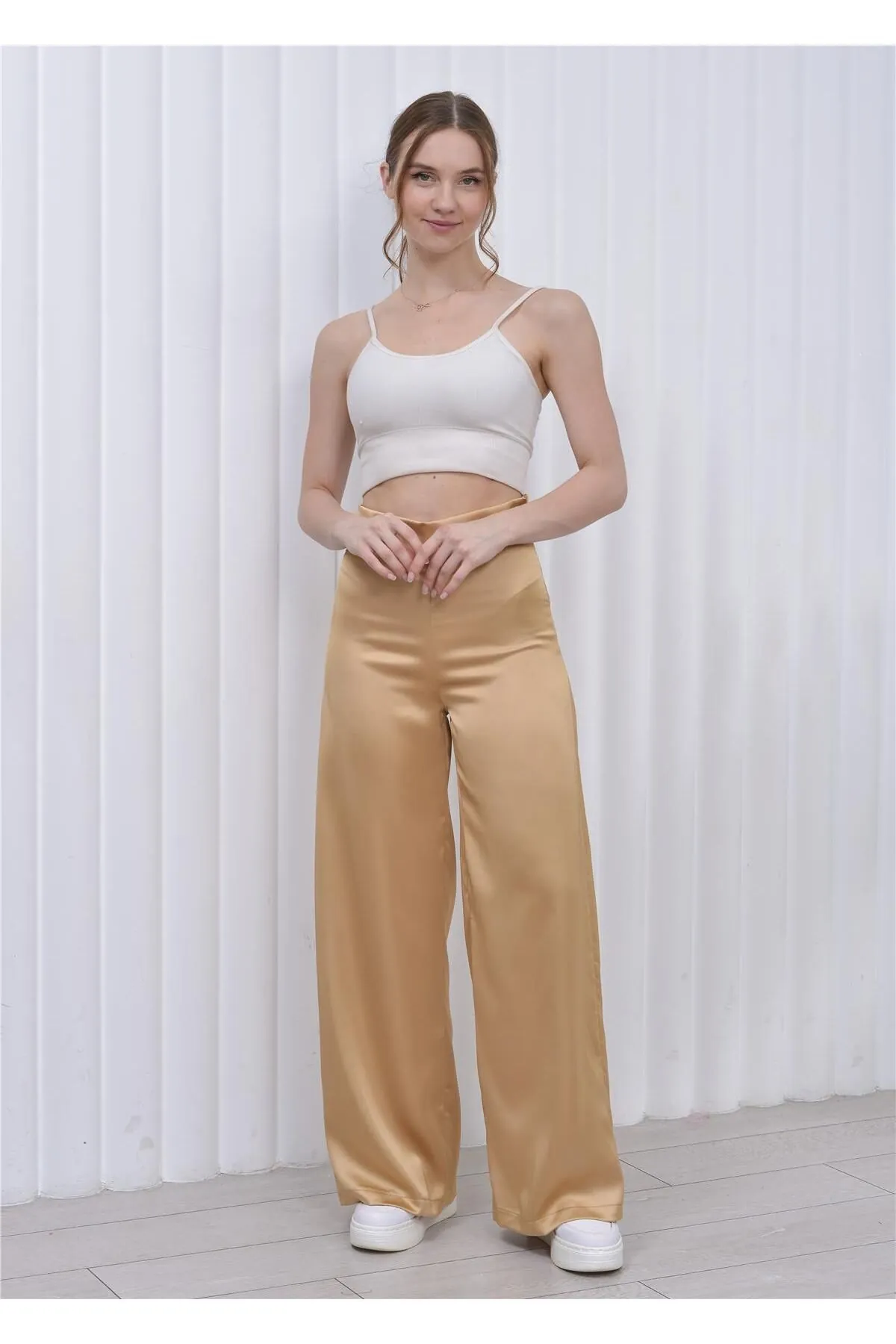 Nuseel Kadın Yüksek Bel Saten Palazzo Pantolon Gold