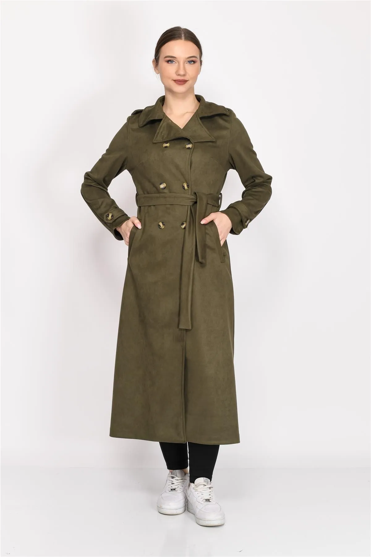Nuseel Kruvaze Yaka Suni Süet Trençkot Haki