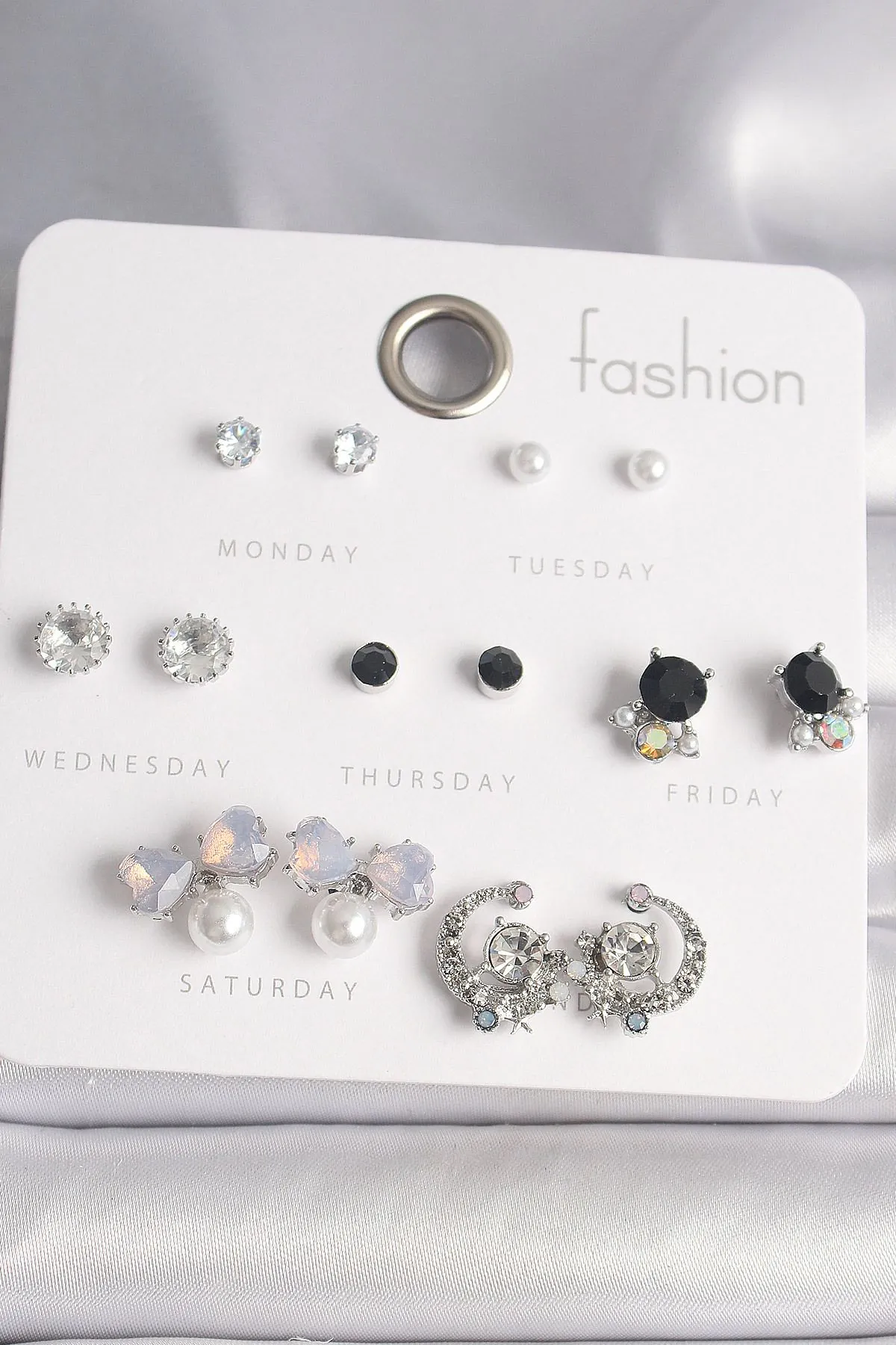 Hepta Collection Pirinç Gümüş Renk Renkli Zirkon Taşlı Kurdela Model Hilal Figür 7 Çift Kadın Küpe S