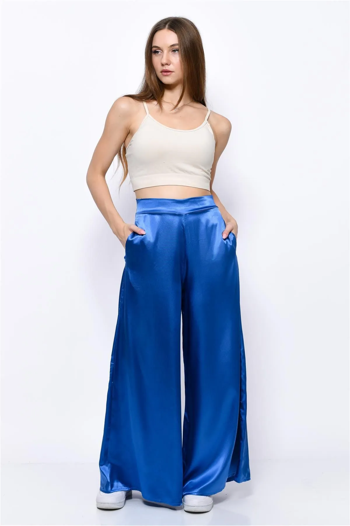 Nuseel Saten Yüksek Bel İspanyol Paça Pantolon Saks