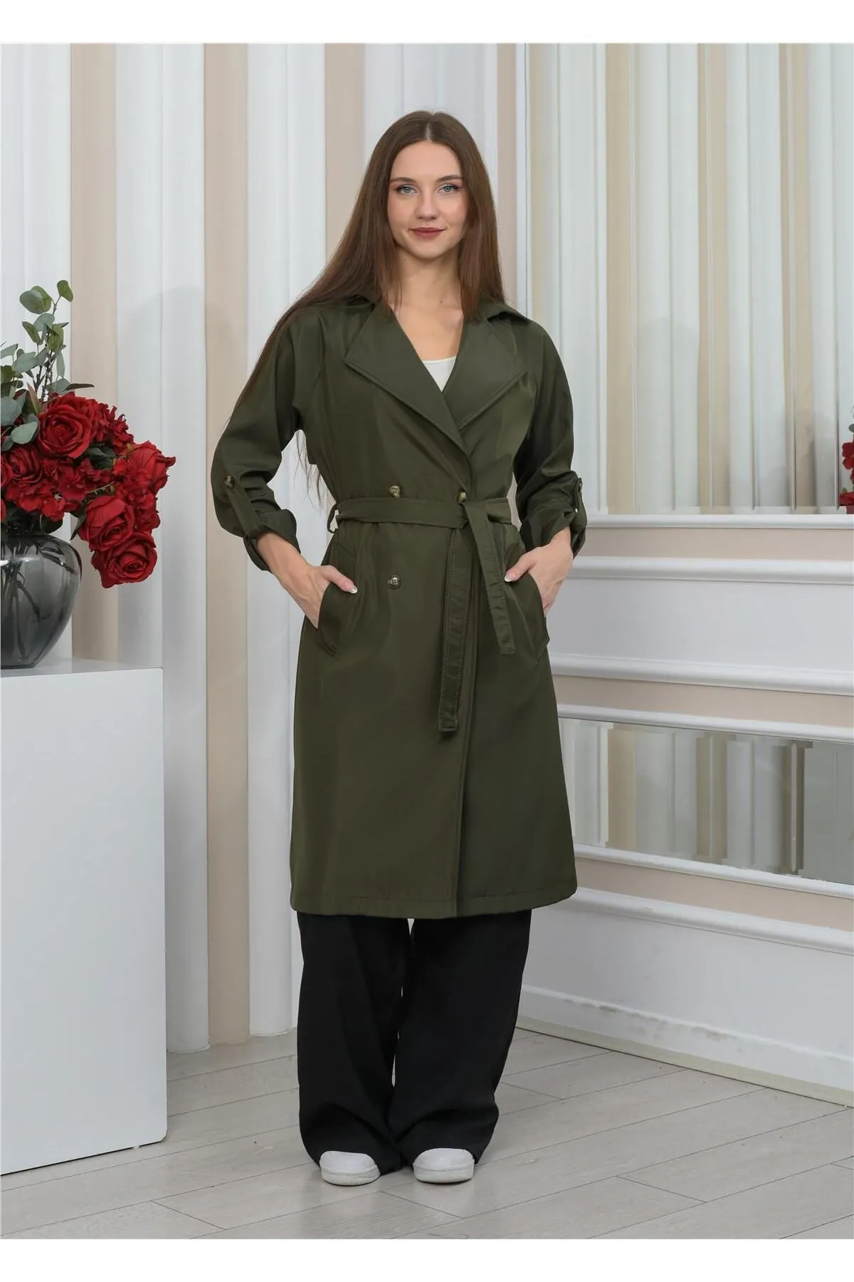 Nuseel Yeni Sezon Oversize Uzun Trençkot Haki