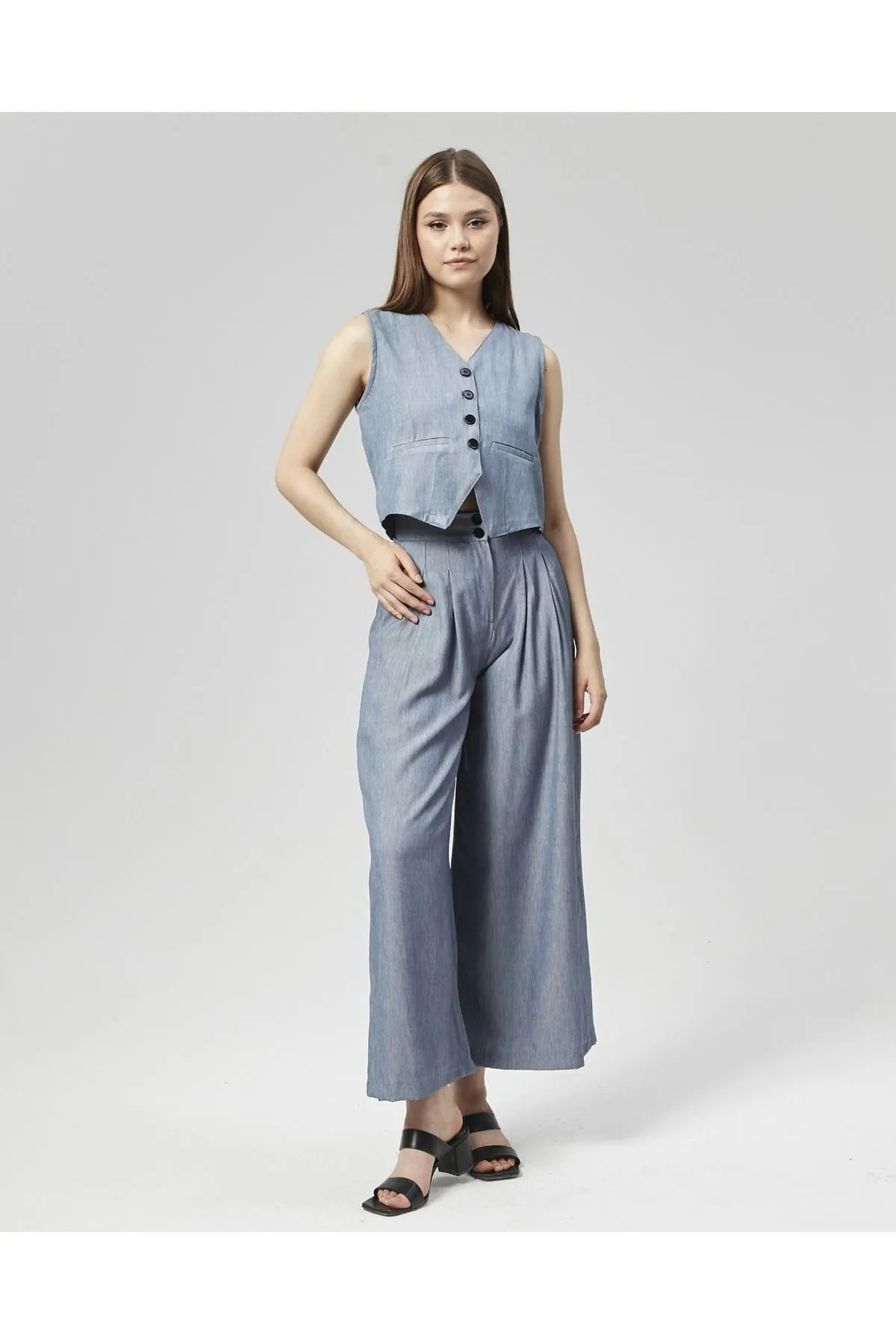 Nuseel Yeni Sezon Pensli Palazzo Pantolon & Yelek Takım Mavi