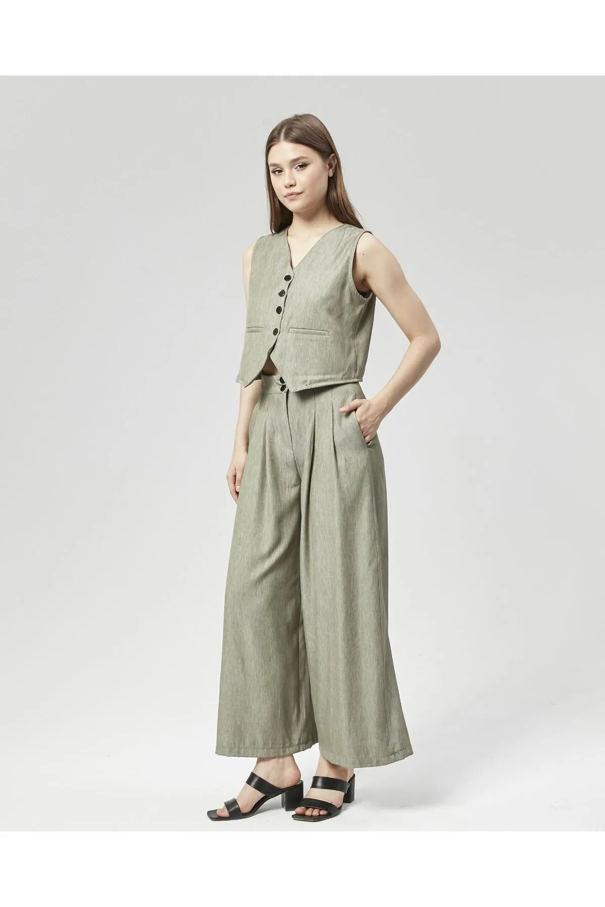 Nuseel Yeni Sezon Pensli Palazzo Pantolon & Yelek Takım Su Yeşili