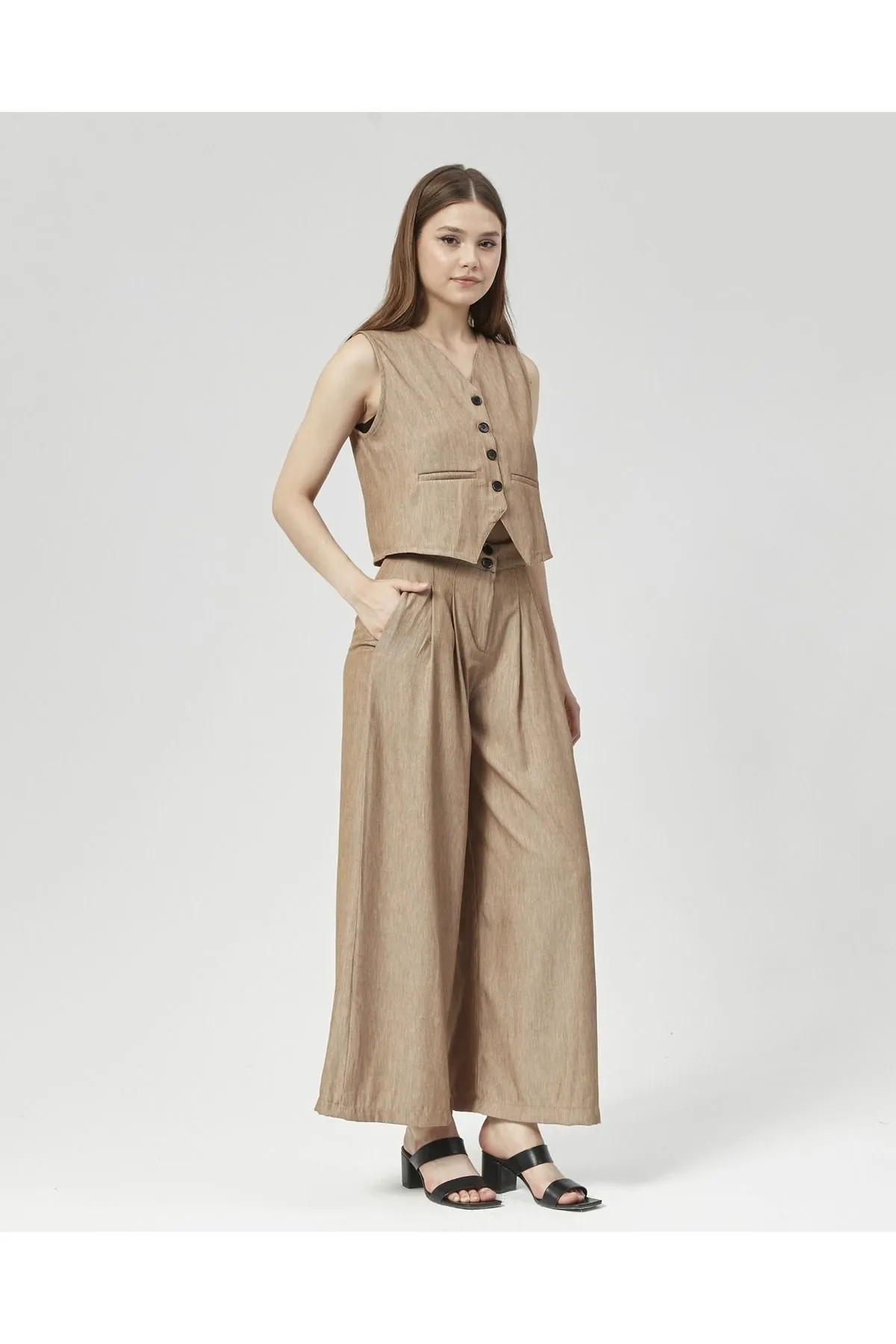 Nuseel Yeni Sezon Pensli Palazzo Pantolon & Yelek Takım Vizon