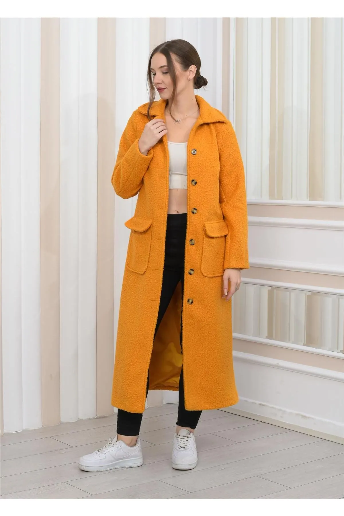 Nuseel Yeni Sezon Yakalı Peluş Kıvırcık Uzun Kaban Hardal