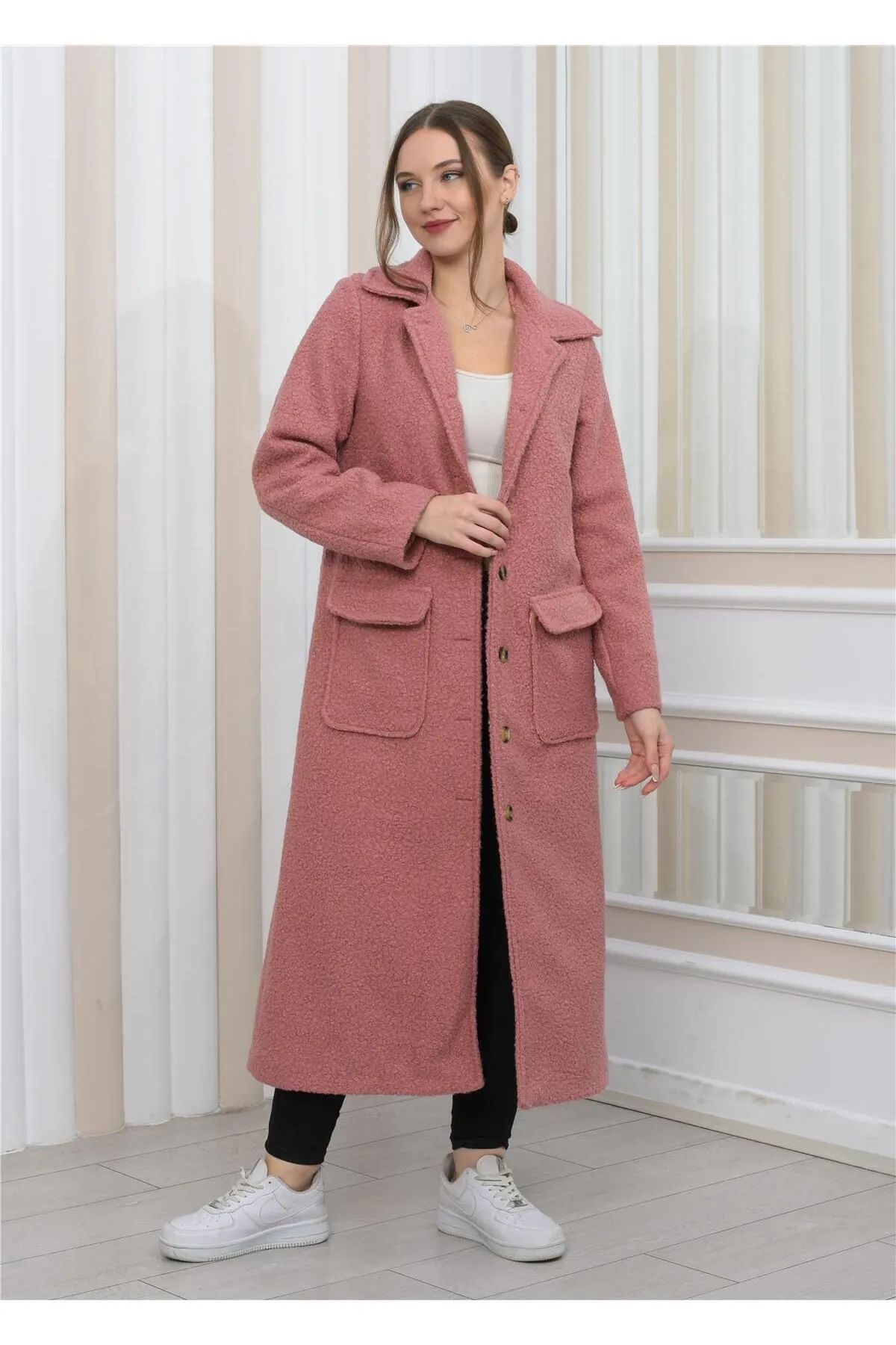 Nuseel Yeni Sezon Yakalı Peluş Kıvırcık Uzun Kaban Pudra