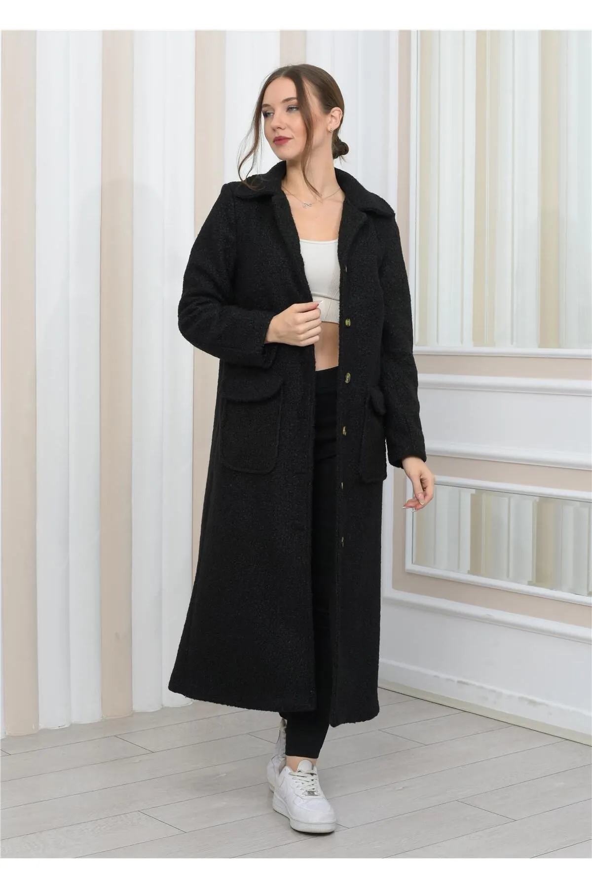 Nuseel Yeni Sezon Yakalı Peluş Kıvırcık Uzun Kaban Siyah