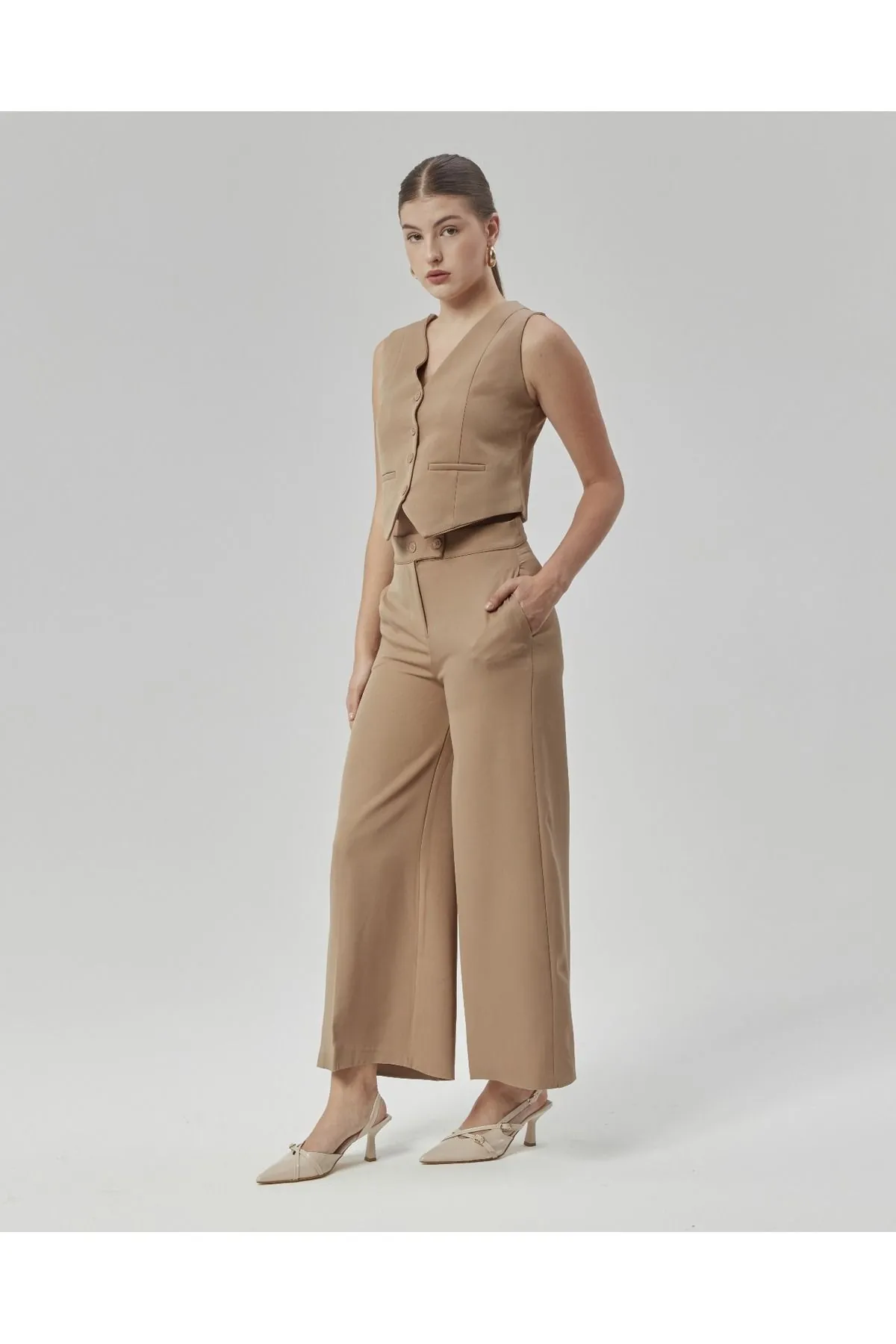 Nuseel Yeni Sezon Yüksek Bel Culotte Pantolon & Yelek Vizon