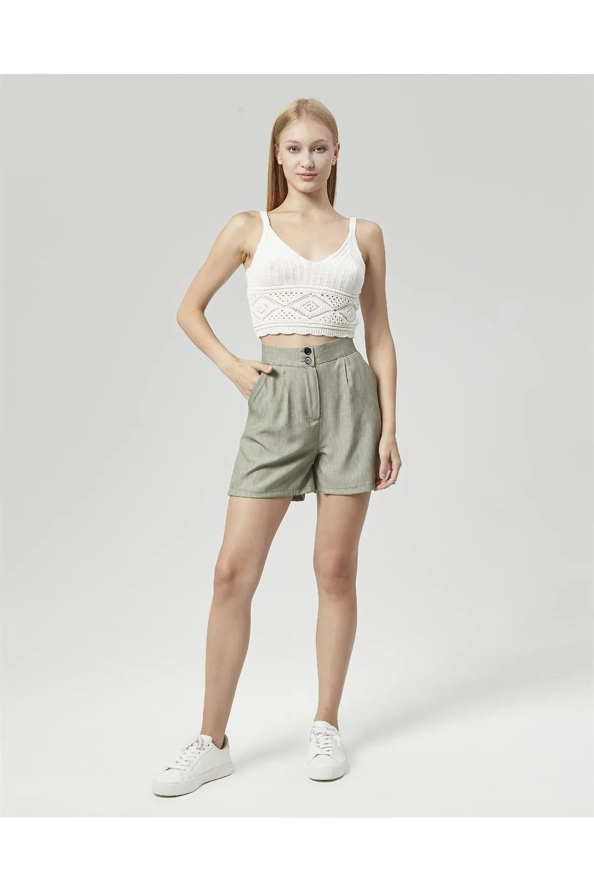 Nuseel Yüksek Bel Atlantis Kumaş Bermuda Şort Su Yeşili